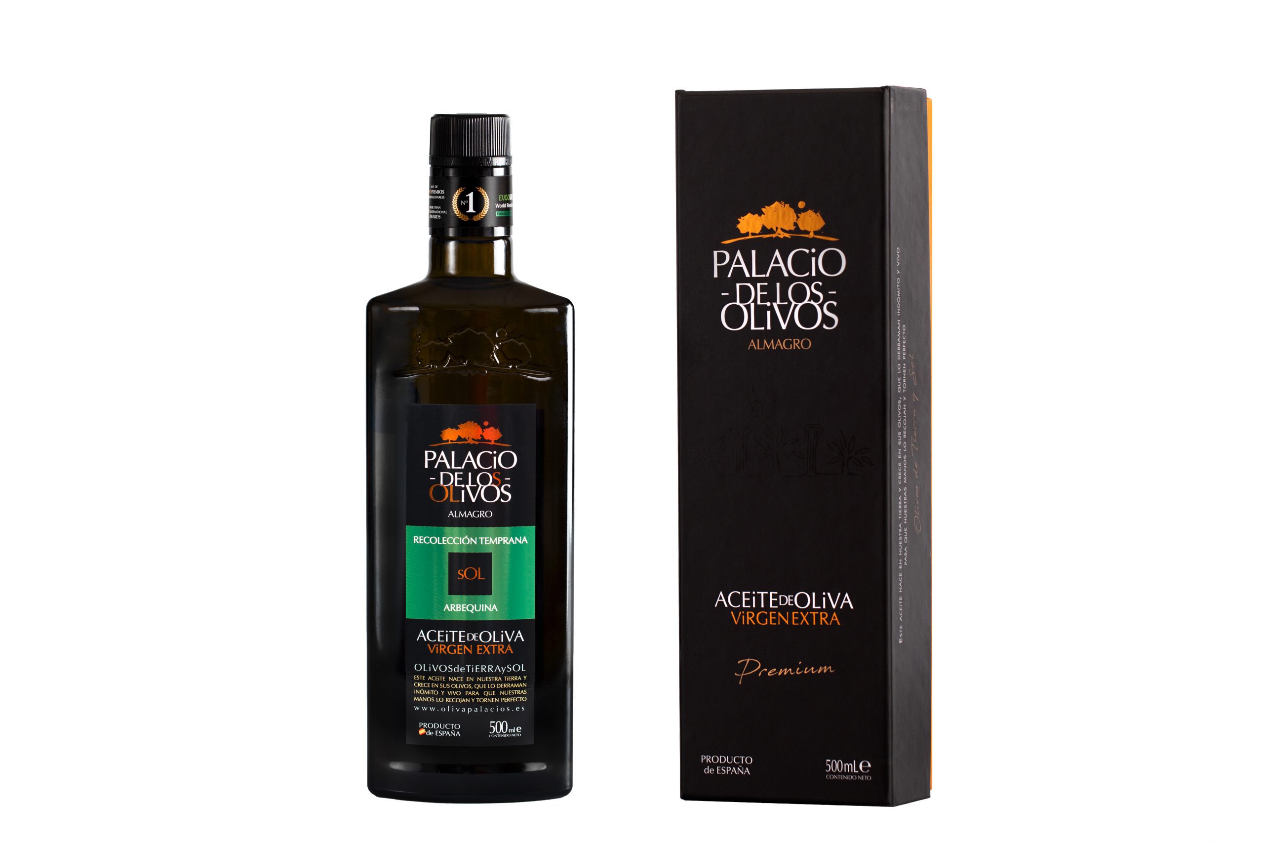 Contenido: 6 Estuches + 6 Botellas de vidrio de 500ml de aceite de oliva virgen extra Premium de variedad de aceituna Arbequina.